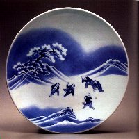 鍋島染付童子雪合戦図三脚附大鉢 製作年代 元禄初期(1688〜1703年) h 8.0 d 30.5 Click on the photo to enlarge it. Home Page